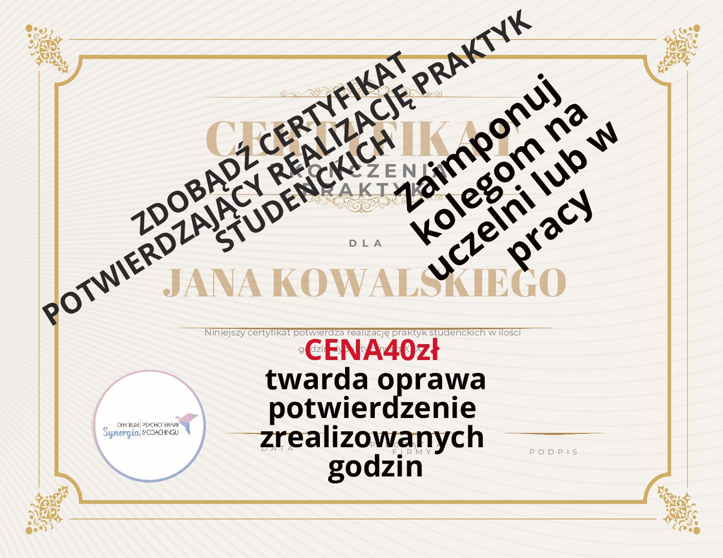 Certyfikat poświadczający ilość godzin. Dostępny OD RĘKI!!!